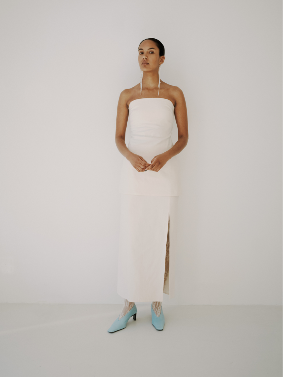 The Pencil Skirt is a high-waisted skirt that fits closely to the body, creating a sleek silhouette. It features a slit on the left side that adds both style and ease of movement. The skirt falls to ankle length and has a zipper in the back.